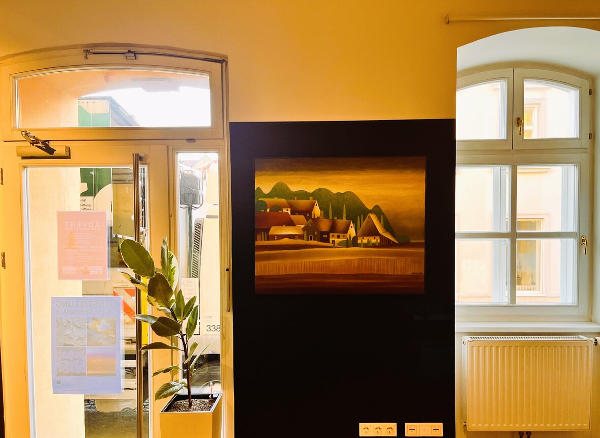 Die gesammelten Spenden des traditionellen Adventslaufs 2025 kommen einer Kainacher Familie, deren Tochter an ME/CSF schwer erkrankt ist, zu Gute. Das Kunsthaus Köflach unterstützt diese Aktion und freut sich, ein exklusives Kunstwerk von Hans Giegerl zugunsten der Familie versteigern zu dürfen. Das Höchstgebot liegt bei € 1.226,–. Die Gebote können bis FR 9. Jänner 17.00 Uhr per E-Mail an ulrike.janach@koeflach.at abgegeben werden. Die feierliche Übergabe an den/die Höchstbietende/n erfolgt im Rahmen der Finissage am 10. Jänner um 17.00 Uhr. Das Bild kann zu den Öffnungszeiten im Büro des Kunsthauses besichtigt werden. Dorf, 2023, Acryl auf Leinwand, 100×80 cm.