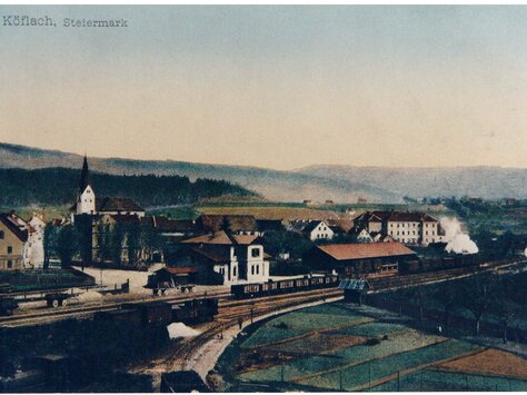 … fand am 3. April die feierliche Eröffnung der Graz-Köflacher-Bahn statt. Die Eisenbahn brachte reges Leben in den einst so stillen Markt. Durch die Erschließung weiter Kohlenfelder und die Anlage moderner Eisenwerke kamen immer mehr Menschen aus nah und fern nach Köflach. 20 Neubauten entstanden im Jahr. In der Bahnhofstraße wurden in den siebziger Jahren die an italienische Vorbilder gemahnenden schönen Häuser erbaut.